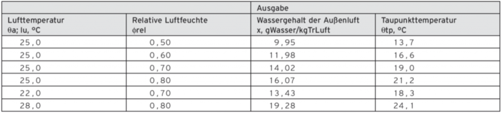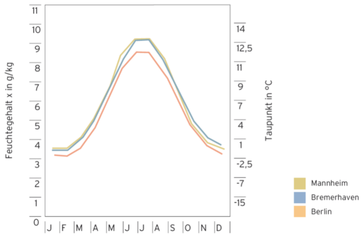 Aufgrund der natürlichen Begrenzung der Kühlleistung wird ein Fußbodensystem nicht immer in der Lage sein, die Raumtemperatur auf einen festen Wert zu regeln. Grundsätzlich muss aber auf jene Vorlauftemperatur geregelt werden die das Risiko der Tauwasserbildung vermeidet. Die Grafik zeigt, dass im Sommer der Feuchtigkeitsanteil der Luft etwas mehr als 9 g/kg Luft erreicht. Bei diesem Wasserdampfgehalt ergibt sich ein Taupunkt von ca. 13 °C (bei einer relativen Luftfeuchte von ca. 55 %). Es empfiehlt sich hier eine Vorlauftemperatur von ca. 20 °C einzustellen. Bei einer Lufttemperatur von 25 °C und einer relativen Feuchte von 70 % wird der Taupunkt erst bei einer Temperatur von 19 °C erreicht. Im Mittel stellt sich im Haus eine relative Luftfeuchte von 50 - 55 % ein, so dass eine Taupunktunterschreitung nicht eintritt. Die obere Luftfeuchtigkeit von 65 % sollte nach EN 814 T1 - T3 und DIN 1946 nicht überschritten werden.
