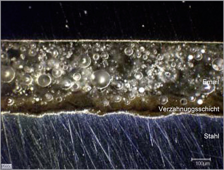 Zunächst einmal muss klar sein, dass das Korrosionspotenzial in einem Trinkwassererwärmer bei jeder Warmwasserentnahme erneuert wird. Immer wieder fließt sauerstoffhaltiges Frischwasser nach und bietet die Grundlage für Rost. Man muss also eine stabile Schicht zwischen Stahl und Wasser bringen. Es bieten sich Schichten an, die als eine Art Farbanstrich einen innigen Kontakt mit dem Stahl eingehen. Oder man bringt einen Stoff auf, der als hygienisches Behältnis schon seit tausenden von Jahren geschätzt wird, das Glas. Dazu stellt man nicht etwa einen Glasbehälter knatscheng in den rostanfälligen Stahlbehälter, sondern bringt dieses Glas erst zum Schmelzen und dann in flüssiger Form auf die Innenwand des zukünftigen Trinkwasserspeichers. Es dürfen dann auch ruhig zwei Schichten werden. Und hat man die richtige Mischung der Glasschmelze für den umgebenden Stahl getroffen, dann kriegt man die beiden aus ihrer innigen Verschmelzung nicht mehr so leicht getrennt. Dabei verhält sich der umgebende Stahl wie die Eisenringe eines Holzfasses. Der Stahl sorgt für die eigentliche Unempfindlichkeit gegen 10 bar Wasserdruck und Stoßeinwirkungen. Nur das Glas, das man in dieser Verwendung auch als Emaillierung bezeichnet, berührt im Wesentlichen das Lebensmittel, genannt „Trinkwasser“. Schwierig für die Innenbeschichtung wird es vielleicht noch an einigen Erhebungen oder tiefen und engen Spalten in dem Stahlbehälter. Hin und wieder werden Bereiche trotz korrekter Vorreinigung der Stahloberfläche und trotz aller Behutsamkeit nicht ausreichend vom flüssigen Glas überdeckt und ragen dann später immer noch nackt in das korrosionstreibende Wasser. Aber ein erheblicher Anteil des unedlen Stahls ist von einer widerstandsfähigen zarten Glasur überzogen.
