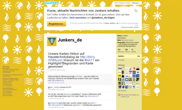 Heizungsbauer, Installateure und deren Kunden erhalten beispielsweise über den Twitter-Kanal www.twitter.com/junkers_de Informationen zu Produktneuheiten, zum Unternehmen, oder auch zu aktuellen Themen aus den Bereichen Heiztechnik und regenerative Energien.