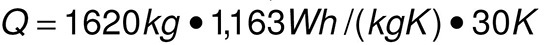 c = die spezifische Wärmekapazität (im Beispiel für Wasser mit 1,163 Wh/(kgK)