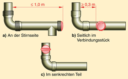 Über Reinigungsöffnungen müssen Abgasanlagen leicht und sicher zu reinigen und auf freien Querschnitt zu prüfen sein. Um das zu gewährleisten, ist mindestens eine untere Reinigungsöffnung erforderlich. Eventuell kann auch eine obere Reinigungsöffnung nötig werden. Die untere Reinigungsöffnung liegt unterhalb des untersten Feuerstättenanschlusses. Sie darf bei Abgasleitungen auch an der Stirnseite des Verbindungsstückes (nicht weiter als 1 m vom senkrechten Teil entfernt) angeordnet werden. Ferner ist es möglich, die Öffnung seitlich am Verbindungsstück, höchstens 30 cm vom senkrechten Teil der Abgasleitung entfernt vorzusehen. Möglichkeit Nummer Drei stellt die Installation unmittelbar nach Einführung des Verbindungsstückes in den senkrechten Teil der Abgasanlage dar. Eine obere Reinigungsöffnung ist bei Anlagen vorzusehen, die nicht von der Mündung aus zu reinigen sind. Die obere Reinigungsöffnung kann bis zu 5 m unterhalb der Mündung über Dach liegen; sie kann also entfallen, wenn die untere Reinigungsöffnung nur 5 m von der Mündung entfernt ist. In Abgasleitungen kann auf die obere Reinigungsöffnung verzichtet werden, wenn nur Gasfeuerstätten einer Nutzungseinheit angeschlossen sind (also zum Beispiel von einer Wohnung oder einer Gewerbeeinheit), die untere Reinigungsöffnung nicht mehr als 15 m von der Mündung der Abgasleitung entfernt ist und der senkrechte Teil nur einmal bis 30° schräggeführt wurde. Sind diese Bedingungen eingehalten, genügt eine untere Reinigungsöffnung im senkrechten Teil der Abgasanlage, wenn deren hydraulischer Durchmesser maximal 200 mm misst. Beträgt der hydraulische Durchmesser der Abgasleitung nicht mehr als 150 mm, kann die Reinigungsöffnung auch in das Verbindungsstück eingesetzt werden. Dann aber ist das Verbindungsstück mit einem Bogen an die senkrechte Leitung anzuschließen, dessen Biegeradius mindestens dem Durchmesser der Abgasleitung entspricht.