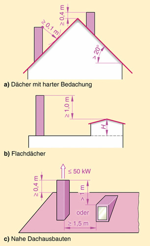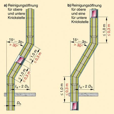 Bei Abgasanlagen mit Schrägführung sind Reinigungsöffnungen vor oder nach den Knickstellen einzubauen, wenn die Ausladung größer ist als der 2fache hydraulische Durchmesser. Bei Abwinkelung von weniger als 15° sind keine Reinigungsöffnungen nötig. Beträgt die Richtungsänderung zwischen 15° und 30°, dürfen die Abstände von den Reinigungsöffnungen zu den Knickstellen bis zu 1,0 m ausmachen. Misst die Richtungsänderung in der Abgasanlage mehr als 30°, dürfen die Abstände zu den Knickstellen nur noch 0,3 m betragen. Aber größere Winkel als 30° sind ja - wie bereits festgestellt - nur zulässig, wenn die Abgase mit Überdruck abgeführt werden. Über Dach müssen die Abgasleitungen und Schornsteine im freien Windstrom enden. Sie müssen bei raumluftabhängigen Feuerstätten bei Dachneigung von mehr als 20° den Dachfirst um mindestens 40 cm überragen oder von der Dachfläche mindestens 1,0 m entfernt sein. Bei Dachneigung von mehr als 40° müssen sie immer mindestens 40 cm über First geführt werden. Abgasabführungen raumluftunabhängiger Gasfeuerstätten mit Abgasventilator (Art C3) und nicht mehr als 50 kW Nennwärmeleistung, dürfen 40 cm über der Dachfläche enden. In schneereichen Gegenden kann der Schornsteinfeger aber größere Maße verlangen. Bei Dächern mit weicher Bedachung, wie Stroh, Schilf, Dachpappe, und bei Verfeuerung fester Brennstoffe, muss der Schornstein am First austreten und diesen mehr als 0,8 m überragen. Zu Dachaufbauten, Dachfenstern und ungeschützten brennbaren Bauteilen (ausgenommen Bedachungen) müssen die Ausmündungen seitlich mindestens 1,5 m entfernt liegen. Ist das nicht möglich, muss die Mündung diese Fenster oder Aufbauten um mindestens 1,0 m überragen. Abweichend von der Muster-Feuerungsverordnung (MusterFeuVO) können von den Bundesländern weiter gehende Anforderungen gestellt werden, wenn Gefahren bzw. unzumutbare Belästigungen zu befürchten sind.