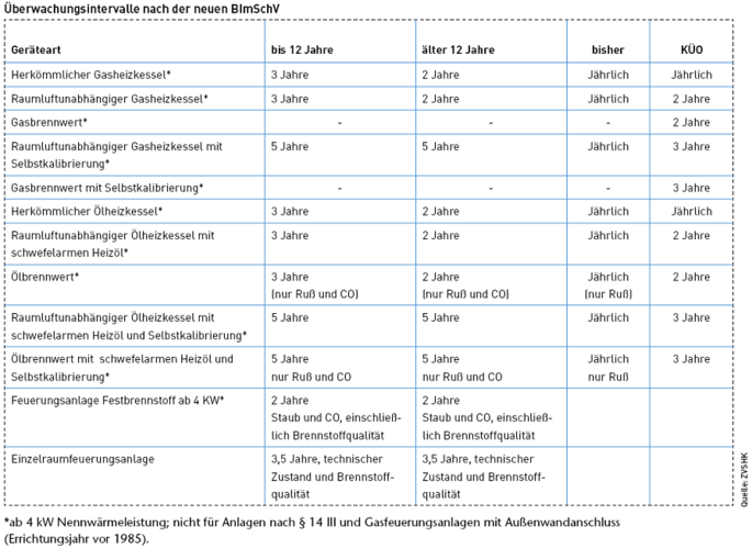 Der Verordnungsentwurf sieht die Verlängerung der Überwachungsintervalle für öl- und gasbefeuerte Heizungsanlagen vor. Die derzeitige jährliche Überwachung wird auf eine dreijährliche bei neuen Anlagen für die ersten zwölf Jahre und anschließend auf eine zweijährliche Überwachung umgestellt. Die Zahl der jährlich zu überwachenden Anlagen wird sich von derzeit 14,5 Millionen auf rund 6,6 Millionen Heizungsanlagen reduzieren. Allerdings hat die Sache auch einen kleinen Haken. Wurden bislang wiederkehrend nur Wärmerzeuger mit einer eingestellten Nennwärmeleistung von >11 kW überwacht, ist dies jetzt schon ab >4 kW Nennwärmeleistung der Fall. Allerdings gelten neue Überprüfungspflichten, die an das Alter des Wärmeerzeugers geknüpft ist.