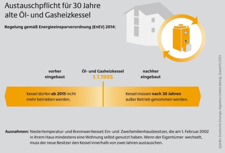 Die neue EnEV sieht vor, dass mehr als 30 Jahre alte öl- und gasbetriebene Standardheizkessel nicht mehr betrieben werden dürfen. Aber: Für alle Ein- und Zweifamilienhausbesitzer, die ihr Haus seit 1. Februar 2002 oder länger selbst bewohnen, entfällt die Austauschpflicht. Bei einem Eigentümerwechsel muss der neue Hausbesitzer die Austauschpflicht innerhalb von zwei Jahren erfüllen. Niedertemperatur- und Brennwertgeräte sind von der Regelung gänzlich ausgenommen.