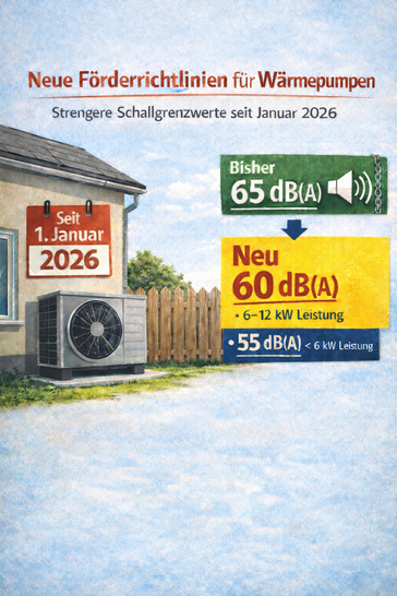 Seit dem 1. Januar 2026 gelten verschärfte Anforderungen für die Bundesförderung von Luft-Wasser-Wärmepumpen. Geförderte Geräte müssen nun zehn Dezibel leiser sein als die EU-Grenzwerte – bisher waren es nur fünf Dezibel. Konkret bedeutet das: Die Fördergrenze liegt bei 60 dB(A) für Geräte mit sechs bis zwölf Kilowatt Leistung, bei geringerer Leistung bei 55 dB(A).