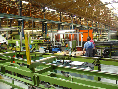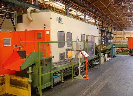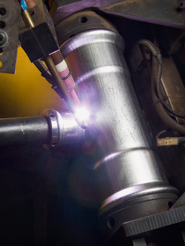 Zuerst werden die Rohre in kurze Stücke geschnitten (Bild 4). Zur präzisen Einstellung der Rohrabschnittslängen ist eine mechanische Bearbeitung der Enden erforderlich. Dann wird das Herstellerkennzeichen eingeprägt. Nicht ohne Stolz zeigt Dieter Blöhs, Betriebsleiter Produktion, auf das kleine „M“ auf der Rohrwand: „Das ist unser Signet und Qualitätslabel.“ Da die Rohrstücke nun ölbehaftet sind, werden sie anschließend gereinigt (Bild 5). Dann geht’s in die Biegeanlage, wo sie in den richtigen Winkel gebogen werden: Stahl kann, für den Laien erstaunlich, in kaltem Zustand umgeformt werden ohne zu brechen. Dafür ist außer gewaltiger Presskraft viel Schmiermittel erforderlich. „Das Faszinierende an Stahl ist, dass man ihn beinahe beliebig umformen kann“, erklärt Thomas Brocker, der Technische Leiter des Werks. Und das, was sich nicht durch biegen herstellen lässt, wird geschweißt; die T-Stücke nämlich. Wie bei der Herstellung der Bogen, kommt auch hier eine Maschine zum Einsatz, die präzise die Schweißverbindung ausführt (Bild 6).