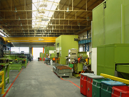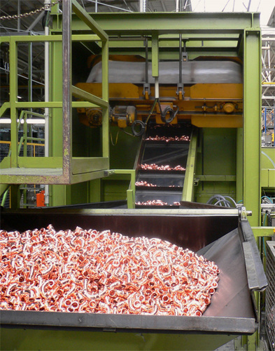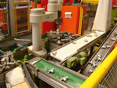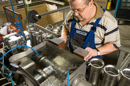 Sind die Fittings gebogen, geht’s ans Pressen. In den Pressen, die in der Pressenhalle (Bild 7) stehen, werden die Enden der Fittings zunächst aufgeweitet und anschliessend in die richtige Grösse bzw. Form gebracht. Dafür wird eine Kraft von bis zu 500 Tonnen aufgewendet (Bild 8). Nun scheint das Formstück eigentlich fertig zu sein – beendet ist der Produktionsablauf aber noch lange nicht. Durch die vorangegangenen Verarbeitungsschritte haben sich edelstahlfremde Metallablagerungen auf der Oberfläche der Fittings gebildet. Sie werden in einer vollautomatischen Beizanlage entfernt. Zusätzlich erhöht das Beizen die Korrosionsbeständigkeit des nicht rostenden Stahls. „In diese Flüssigkeit sollte man keinesfalls den Finger halten“, mahnt Dieter Blöhs. Hautkontakt mit der ätzenden Säure wäre fatal. Sollte es trotz allerhöchster Sicherheitsvorkehrungen dazu kommen, stehen spezielle Duschen zur Verfügung, mit denen man die Säure neutralisieren kann.