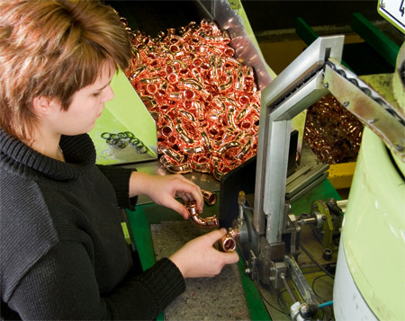 Der nächste Bearbeitungsschritt ist spektakulär anzusehen: Fittings in Flammen. Durch die Bearbeitung verfestigt der Edelstahl so, dass er sich vom Anlagenmechaniker nicht mehr verpressen liesse. Deshalb wird er durch eine Glühbehandlung bei Temperaturen von über 1000 Grad Celsius wieder in einen verformungsfähigen weichen Zustand gebracht. In der Produktion hat Qualität höchste Priorität. Umgesetzt wird dieser Anspruch schon vor dem Verarbeitungsprozess, in der Wareneingangskontrolle nämlich: “Wir prüfen genau, ob das eingehende Material in Ordnung ist“, erklärt Reinhard Weiss, Leiter der Qualitätssicherung. Alles andere als Werkstoff von höchster Qualität fällt durch. Auch am Ende des Produktionsprozesses wird nichts dem Zufall überlassen. Alle geschweissten Formstücke, zum Beispiel T-Stücke, werden auf ihre Dichtheit kontrolliert. Das geschieht entweder in einer voll automatischen Differenzdruck-Prüfanlage (Bild 9) oder mit einem Luft-unter-Wasser-Test (Bild 10). Was danach noch fehlt, ist nur der Dichtring. Er wird an der Einringanlage in Einzelarbeit eingefügt (Bild 11).