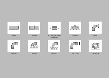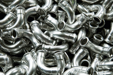 Beim Betreten der Produktionshalle in Langenfeld sind die Eindrücke ungewohnt. Metallische Geräusche füllen den Raum, in dem es nach Öl riecht. Lange Stahlrohre werden mit einem massiven Kran transportiert. Angestellte mit Gehörschutz arbeiten an denn unterschiedlichsten Produktionsanlagen. In einer Ecke steht eine Kiste mit glänzenden Kupfer Fittingen – so schön anzusehen, dass man am liebsten seine Taschen mit ihnen füllen möchte. Und auch die Schüttung von Edelstahlfittingen ist eher ungewohnt anzuschauen; wann sieht man schließlich schon mal so viele Verbinder auf einem Haufen (Bild 1)? An einer Infowand ist der Produktionsablauf dargestellt. Der erste Eindruck: Das ist eine komplizierte Geschichte (Bild 2). Doch schön der Reihe nach: Alles beginnt mit dem Rohr (Bild 3). Die Verarbeitung der Rohre zu Fittings ist die Kunst, die man hier beherrscht. Die dazu notwendigen Arbeitsschritte werden im Folgenden am Beispiel Edelstahl dargestellt.