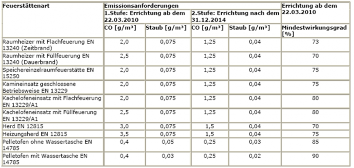 Einzelraumfeuerungsanlagen für feste Brennstoffe, die ab dem 22.03.2010 und vor dem 01.01.2015 errichtet werden und somit die Grenzwerte der Stufe 1 einhalten, dürfen auch nach dem 01.01.2015 weiterbetrieben werden.