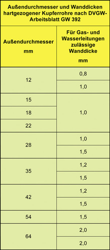 Ist diese Produktnorm auch auf dem Rohr angegeben, spricht man von einem „Verwendungsnachweis durch Normentsprechung“ oder schlichtweg von einem „Werksnachweis“. Ein Zertifizierungszeichen ist nicht erforderlich. Als Baumuster geprüft und zugelassen müssen nur die Produkte sein, deren Produktnormen in das Regelwerk des DVGW aufgenommen wurden. Diese, vom DVGW „adoptierten“ Produktnormen, sind in den TRGI durch ein Sternchen gekennzeichnet. Eine Ausnahme stellt hier das Kupferrohr dar. Die Produktnorm DIN EN 1057 [2] ist nicht in das DVGW-Regelwerk aufgenommen und dennoch dürfen nur Kupferrohre mit einem DVGW-Zertifizierungszeichen (in Form der DV-Nummer) in Gas-Installationen Verwendung finden. Das liegt daran, dass die Rohrverbindungen an Kupferrohren nach DVGW-Arbeitsblatt GW 2 [3] hergestellt werden müssen. Mit dem GW 2 wird die Verarbeitung von Rohren verlangt, die nach DVGW-Arbeitsblatt GW 392 [4] geprüft sind und folglich ein DVGW-Zertifizierungszeichen tragen. Mit dem GW 392 ist auch festgelegt, welche Wanddicken die Kupferrohre haben müssen. Die aktuelle Fassung vom Juli 2009 lässt in diesem Bereich Verringerungen zu. Während es beim 15ner, 18ner und 22iger Rohr bei einem Millimeter Wanddicke bleibt, dürfen jetzt auch 28iger Rohre mit einem Millimeter Wanddicke (früher mindestens 1,5 mm) verarbeitet werden. Für 35iger und 42iger Rohre genügen jetzt 1,2 mm Wanddicke (früher mindestens 1,5 mm) und das 54iger kann jetzt mit 1,5 mm Wanddicke (früher mindestens 2,0 mm) an den Start gehen. Neu auf Kupferrohren ist seit März 2009 die CE-Kennzeichnung. Aber Vorsicht: Diese ziert auch Rohre, die für den Einsatz in Gas- und Wasserleitungen nicht die geforderten Wanddicken besitzen.