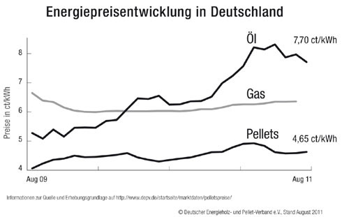 „Die Preise für Holzpellets sind generell stabil, da Deutschland europaweit über die höchste Produktion verfügt. Damit ist der Pelletpreis keinen Spekulationen an den internationalen Energiemärkten ausgesetzt“, sagte Martin Bentele, geschäftsführender Vorsitzender des DEPV in Berlin. „Auch angesichts der Ankündigung vieler Erdgasanbieter in den nächsten Monaten die Preise zu erhöhen, ist die Investition in das nahezu klimaneutrale Heizen mit Pellets nicht nur aus Umweltschutzgründen, sondern auch wirtschaftlich sinnvoll.“ Während ein Liter Heizöl bei Abnahme von 3.000 Litern zurzeit 82 Cent kostet, sind zwei Kilogramm Holzpellets, die etwa den gleichen Energiegehalt aufweisen, mit 50 Cent fast 40 Prozent preiswerter1. Nach wie vor gibt es auch staatliche Zuschüsse für den Austausch einer mit fossilen Brennstoffen betriebenen Heizung gegen eine moderne Pelletheizung.