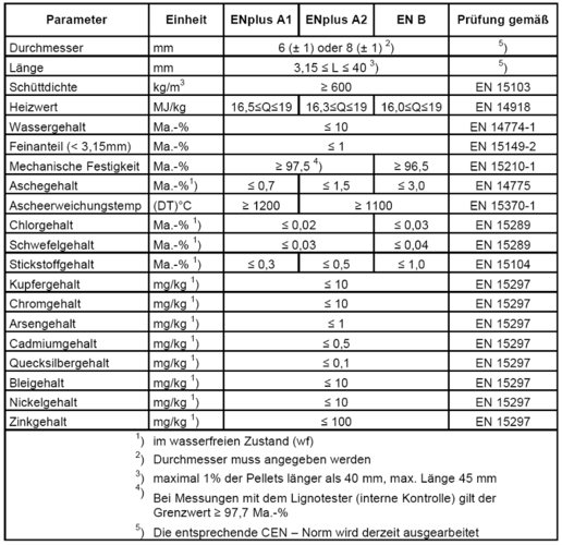 In der folgenden Tabelle sind die Parameter zur Beurteilung der Pelletqualität aufgeführt, die im Rahmen dieses Zertifizierungssystem von Bedeutung sind.