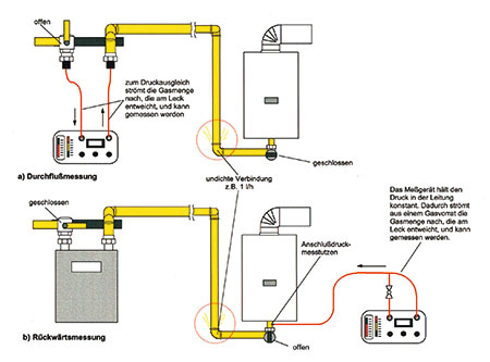Man unterscheidet beim Einsatz elektronischer Leckmengenmessgeräte das Durchflussmessprinzip und das Verfahren der Rückwärtsmessung. Bei letzterem wird der Prüfdruck vom Gerät konstant gehalten. Das Messgerät kann dafür an beliebiger Stelle an die zu prüfende Leitung angeschlossen werden. Die Leitung wird durch Schließen einer Armatur vom gasführenden System getrennt. Ist die Leitung undicht, kommt es zu einem Druckabfall. Dieser wird vom Messgerät ausgeglichen, indem eine Gasmenge in die Leitung nachgeschoben wird. Die Gasmenge, die ständig nachgeliefert werden muss, um den Druck zu halten, wird gemessen. Vorteilhaft ist, dass die zu prüfende Leitung keine Verbindung zum in Betrieb befindlichen System hat. Druckschwankungen haben so keinen Einfluss auf die Leckmengenermittlung. Im Gegensatz zur Rückwärtsmessung setzt eine Durchflussmessung immer einen Anschluss am Gaszählerplatz oder am Druckregelgerät voraus. Dabei ist die zu prüfende Leitung über das Messgerät mit dem gasführenden Leitungssystem verbunden. Das Gas, was nach Druckausgleich über das Leckmengenmessgerät in die zu prüfende Leitung nachströmen muss, um den leckbedingten Druckabfall auszugleichen, wird gemessen und zur Anzeige gebracht.