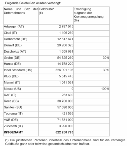 Die Kommission berücksichtigte außerdem das kooperative Verhalten von Grohe (Deutschland) und Ideal Standard (USA) und minderte ihre Geldbußen um jeweils 30 %. Außergewöhnlich ist, dass aufgrund der schwierigen finanziellen Lage bestimmter Betroffener die Geldbußen dreier Unternehmen um 50 % und die zweier weiterer Unternehmen um 25 % ermäßigt wurden. Insgesamt gaben zehn Unternehmen an, dass sie nicht in der Lage seien, eine Geldbuße zu bezahlen.