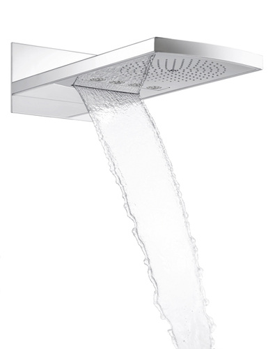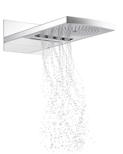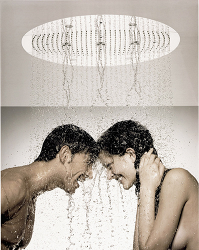 Aber nur, wenn er es wünscht. Bei den verstellbaren Varianten der Raindance Handduschen, der Deckendusche Rainmaker und der Kopfdusche Rainfall kann zwischen manuell verstellbaren Strahlarten gewählt werden. Neben dem Tropfen-Regen steht auch eine Massage-Einstellung zur Verfügung. Dabei tritt das Wasser über drei sich drehende Whirldüsen aus und sorgt für massageähnliche Entspannung. Auch bei dieser Strahlart wird das Duschvolumen durch die angesaugte Luft vergrößert. Daher trügt der Schein, diese Dusche würde sehr viel mehr Wasser benötigen als ihre normalen Kollegen. Der Massagestrahl lässt sich auch zusammen mit dem Tropfen-Regen nutzen. Ohne Luftbeimischung funktioniert der Schwallstrahl des horizontalen Duschpaneels Raindance Rainfall, der für Wassergenuss in seinen natürlichsten Formen steht. Wie ein echter Wasserfall sprudelt auf einer Breite von 17 Zentimetern der satte Wasserschwall aus der Dusche. Auch bei den Kopfduschen geht der Trend buchstäblich in die Breite. Denn je großflächiger die Strahlscheibe ausfällt, umso großzügiger wird der Körper des Duschenden mit Wasser benetzt, bei den großen Kopfduschen sogar komplett umhüllt. So kommt die Deckendusche Rainmaker mit ihrem Durchmesser auf satte 60 Zentimeter. Aus mehr als 350 Öffnungen tritt im Vollbetrieb das Wasser aus, sodass selbst zwei Duschende komplett im Duschregen stehen und sich darunter frei bewegen können, ohne mit der kälteren Luft in Kontakt zu kommen.