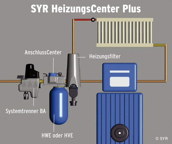 Mit dem HeizungsCenter plus hat der Korschenbroicher Systemanbieter SYR eine wirkungsvolle Armaturenkombination im Programm, die dank umfassender Ausstattung für eine störungsfreie Heizungsanlage sorgt: Die praktische Kombiarmatur aus vollautomatischer Nachfülleinrichtung mit Leckageschutz, SYR AnschlussCenter für Enthärtungs- bzw. Vollentsal-zungskartuschen und automatischem Heizungsfilter bildet eine kompakte Station zur Befüllung, Entschlammung und Entgasung der Heizungsanlage inklusive Enthärtung bzw. Entsalzung des Füllwassers.