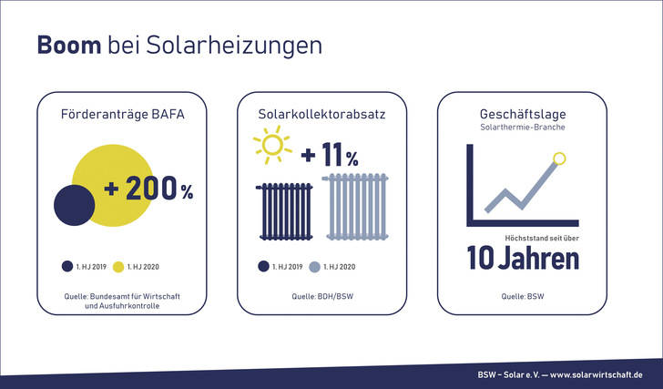 Die zu Jahresbeginn deutlich verbesserten Förderkonditionen für Solarwärme-Anlagen im Rahmen des neu aufgelegten Marktanreizprogramms (MAP) greifen. Im ersten Halbjahr 2020 sind über 200 Prozent mehr Solarthermie-Förderanträge gestellt worden als im Vorjahr. Dies geht aus jetzt vom Bundesamt für Wirtschaft und Ausfuhrkontrolle (BAFA) veröffentlichten Zahlen hervor. Solarheizungen werden seit Anfang 2020 im Förderprogramm „Heizen mit Erneuerbaren Energien“ mit bis zu 35 Prozent – beim Austausch einer Ölheizung sogar mit bis zu 45 Prozent – bezuschusst. Nach Angaben des Bundesverbandes Solarwirtschaft e. V. (BSW) nutzen bereits 2,5 Millionen Haushalte in Deutschland Solarthermie-Anlagen für die Erzeugung von Raumwärme oder zur Brauchwasser-Erwärmung