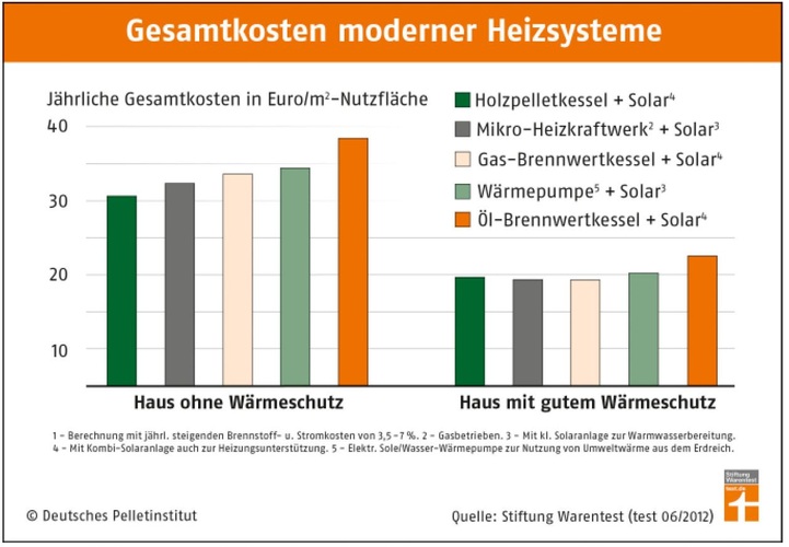 Laut Stiftung Warentest (test 6/2012) kann man mit einer Pelletheizung als „Hightech-Variante des Kaminofens“ nicht nur zum Klimaschutz beitragen, sondern auch Geld sparen. Denn den größten Einfluss auf die Heizkosten hat der Brennstoff. Da Holzpellets rund 45 Prozent günstiger als Heizöl und 30 Prozent günstiger als Erdgas sind, können die kleinen Presslinge hier deutlich punkten. In einem Haus ohne Wärmeschutz liegen die Kosten für eine Holzpelletheizung deutlich unter den anderen vier getesteten Heizsystemen. Der Umstieg auf die Heizalternative Pellets lohnt sich dabei