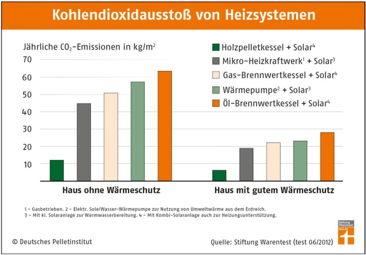 Da Holz ein nachwachsender Rohstoff ist, verbrennen Pellets nahezu klimaneutral. Stiftung Warentest bescheinigt den kleinen Presslingen daher sowohl im Haus ohne Wärmeschutz als auch im gut gedämmten Haus die beste Klimabilanz. „Mit dem Austausch des Heizsystems kann man grundsätzlich am kosteneffizientesten Energiekosten einsparen und die CO2-Belastung reduzieren“, erläutert Martin Bentele, Geschäftsführer des Deutschen Pelletinstituts. „ Das ist insbesondere in dem Zusammenhang zu sehen, dass bei vielen Gebäuden in Deutschland auch künftig eine umfassende Wärmedämmung aus Kostengründen oder wegen anderer Hemmnisse nicht vorgenommen wird.“