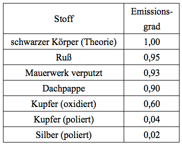 Die Einflüsse auf Wärmestrahlung sind für die menschlichen Sinne schwieriger zu erfassen als jene für die Konvektion. Nur so viel: Mattschwarze Oberflächen mit einer gleichen Temperatur wie eine gleichgroße weiße oder gar silberne Oberfläche geben unterschiedlich Wärme ab. Dies hängt mit dem so genannten Emissionsgrad dieser Oberflächen zusammen. Hier einige Beispiele für die Emissionsgrade verschiedener Oberflächen: