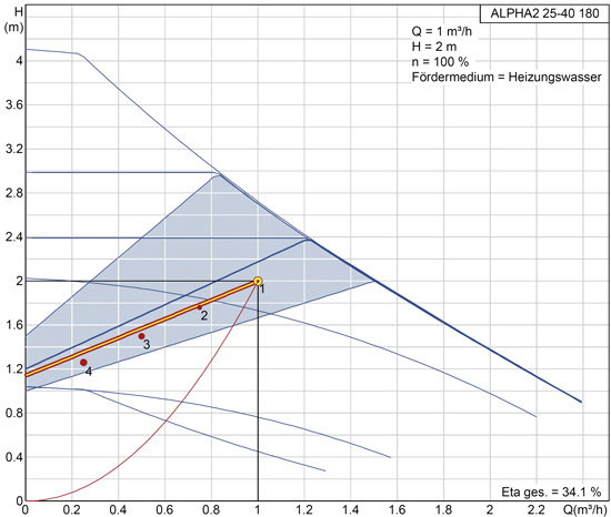 Der Rest läuft mit gerade mal einem Viertel der Auslegungsleistung (Punkt 4 der Kennlinie). Der „worst case“ ist also die seltene Ausnahme. Die Pumpe ist demnach während ihrer Lebenslaufzeit hauptsächlich unterfordert. Möge es uns doch auch so gehen.