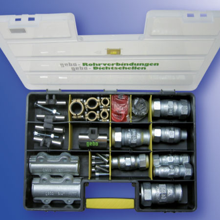 Klar muss und kann man im Reparaturfall nicht immer das eben beschriebene Verfahren der Klemmverbindung anwenden. Es sind auch Techniken ausgereift, die mittels Dichtband funktionieren. Ein Hersteller diese Art der Reparaturanwendungen ist ebenfalls Gebo. Hier werden flexible Edelstahl-Dichtbänder hergestellt, die für die Abdichtung von Löchern, Rissen und porösen Stellen genutzt werden können. Und zwar für alle Rohrarten. Durch Ihre „von-bis“ Abmessungen sind die Edelstahldichtbänder flexibel einsetzbar. Ein Muss in jedem Servicefahrzeug, da die kleinen Alleskönner wenig Platz brauchen und nicht viel wiegen. Um die gängigen Dichtsätze griffbereit zu haben werden auch so genannte Gebo-Notfallkoffer angeboten. Der Notfall-Koffer ist für die schnelle Hilfe vor Ort vorgesehen. Mit allem, was im Falle des Falles helfen kann: Verschraubungen in verschiedenen Dimensionen, drei Varianten an Dichtschellen und diverse Umbausätze für das Umrüsten der Zoll-Verschraubungen auf PE- und Siederohrmaße. Für die nachträgliche Schaffung von Abzweigen oder die Installation von Entleerungshähnen sind die Anbohrschellen als preiswerte Lösung nicht wegzudenken. Verwand mit diesen flexiblen Dichttechniken ist die Längenausgleichsverschraubung. Diese verstellbaren Messing-Verschraubungen für Wasserzähler- und Ventilanschlüsse sind bei kniffeligen Installationen sehr hilfreich. Man denke nur an die in Nischen eingebauten Heizkörper. Die entsprechenden Ventile und Rücklaufverschraubungen lassen sich oft erst durch den Einsatz dieser Elemente realisieren. Über eine Gewindeverstellung kann hier ein Abstand von bis zu 25 mm ausgeglichen werden. Nicht umsonst sind diese Verschraubungen seit Jahren ein Problemlöser auch für zahlreiche Versorgungsunternehmen.