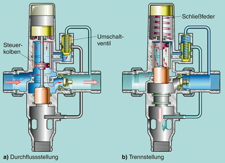 Schott: Der Rohrtrenner der EA 2 ist eine Sicherungsarmatur, die im Gegensatz zum EA1 immer in Trennstellung steht und nur bei Wasserentnahme in Durchflussstellung geht. Das Umschalten von Trenn- in Durchflussstellung kann durch eine hydraulische, elektrische oder elektronische Steuereinheit erfolgen. In der DIN EN 1717 sind elektrische bzw. elektronisch Steuerungen aber nicht mehr aufgeführt. Der Durchfluss beginnt bei einer Druckdifferenz zwischen Eingang und Ausgangsseite von 0,15 bar, die Durchflussstellung ist erreicht bei einer Druckdifferenz größer 1 bar. Damit alles störungsfrei funktioniert, sollte der Eingangsdruck mindestens 1,5 bar betragen. Um Schwingungen zu vermeiden muss die Mindestdurchflussmenge 0,02 l/s betragen - eine normale Entnahmearmatur wird dabei schon auf eine Wasserentnahme von 0,07 l/s ausgelegt.