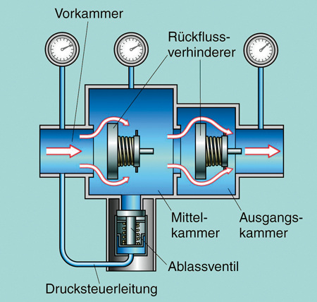 Schott: Beim Systemtrenner, europäisch kurz auch einfach Sicherungsarmatur BA, muss man nichts groß rechnen. Wann sich die Mittelkammer entleert, hängt vom Differenzdruck ab. Systemtrenner Typ BA sind in drei Zonen unterteilt. In der Vorkammer (Zone 1) ist der Druck höher als in der Mittelkammer (Zone 2), dort wieder höher als in der Ausgangskammer (Zone 3). Der Druckabfall ist in jeder Zone genau bestimmt. Das Ablassventil in Zone 2 öffnet spätestens dann, wenn der Differenzdruck zwischen Vor- und Mittelkammer auf 0,14 bar abgesunken ist (und eine Gefahr des Rückdrückens oder Rücksaugens besteht). Das Wasser aus der Mittelkammer strömt ins Freie. Das Leitungssystem ist unterbrochen und gesichert.