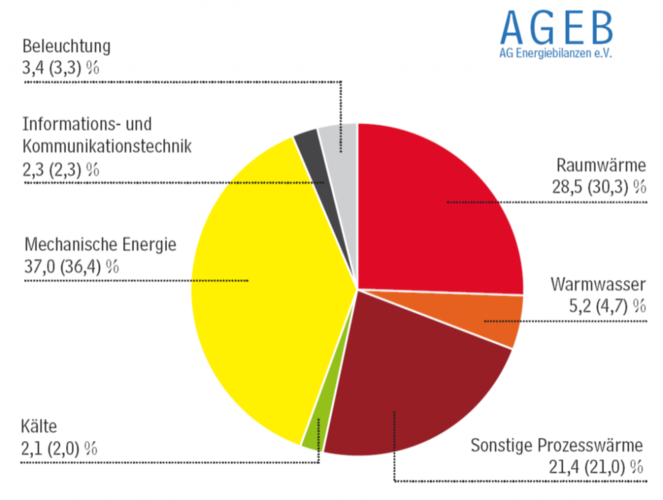 Mehr als die Hälfte des gesamten Endenergieverbrauchs in Deutschland wird für Wärmezwecke eingesetzt. Etwas mehr als ein Drittel entfällt auf Motoren und Antriebe (Mechanische Energie). Der Anteil für Beleuchtung und Kommunikationstechnik liegt bei weniger als 6 Prozent. Quelle: Arbeitsgemeinschaft Energiebilanzen
