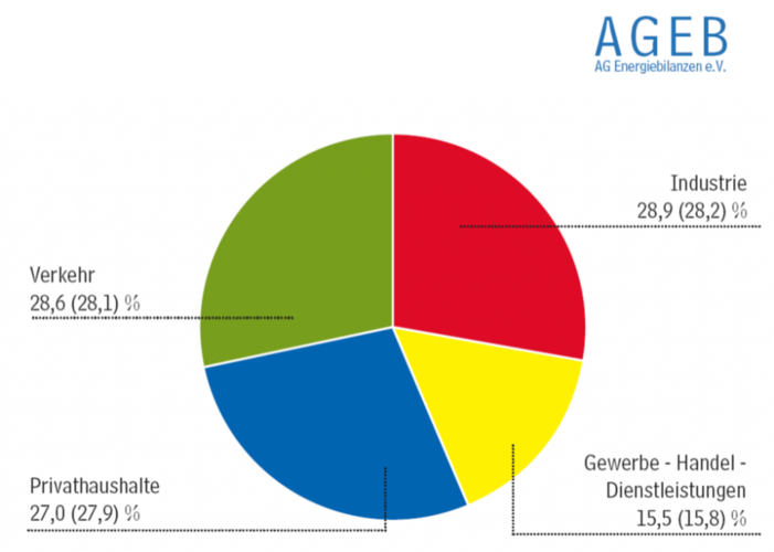 Endenergie wird in Form von Wärme, Kälte, Prozess- und mechanischer Energie sowie für Beleuchtung und Elektronik benötigt. 2012 lagen die Sektoren private Haushalte, Industrie und Verkehr fast gleichauf. Gegenüber dem Vergleichswert von 2008 gab es nur leichte Verschiebungen. Quelle: Arbeitsgemeinschaft Energiebilanzen