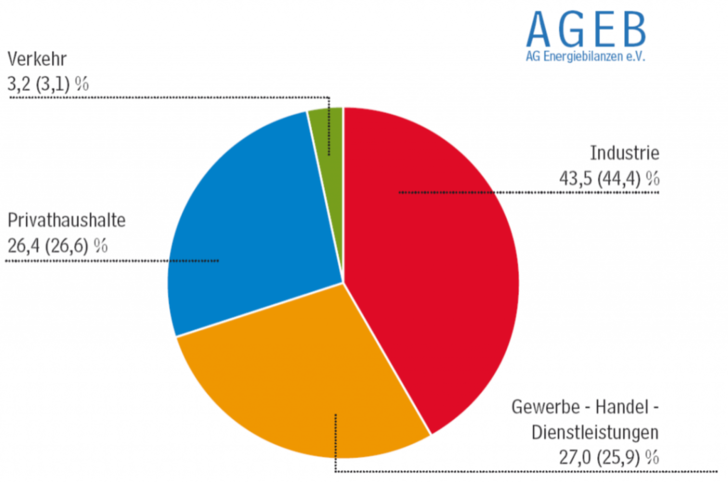 Die Industrie ist der mit Abstand größte Stomverbraucher in Deutschland. Knapp die Hälfte des Stromverbrauchs im Endenergieverbrauch entfällt auf industrielle Prozesse. Jeweils ein gutes Viertel entfällt auf den Bereich Gewerbe-Handel-Dienstleistungen sowie auf die privaten Haushalte. Der Bereich Verkehr spiegelt vor allem den Strombedarf des schienengebundenen Verkehrs wider. Quelle: Arbeitsgemeinschaft Energiebilanzen