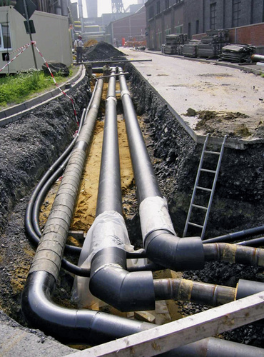 Nun muss die Wärme vom Ort ihrer Entstehung natürlich zum Kunden. Und das geschieht über die Rohrleitungen des Fernwärme-Versorgungsnetzes. Meist wird darin Wasser als Wärmeträger eingesetzt. Es ist günstig und (fast) überall verfügbar. Die spezifische Wärmekapazität ist mit 1,163 Wh/(kgK) naturgemäß sehr hoch. Eine hohe Wärmekapazität bedeutet, dass man hier schon bei einer Bewegung von verhältnismäßig geringen Massen recht große Wärmemengen transportieren kann. Würde Luft durch die Rohre gepustet, müsste beispielsweise die 3,5-fache Masse in Bewegung gesetzt werden, um die gleiche Wärmemenge zum Kunden zu transportieren. Und Fernwärmeversorger sind nun mal keine Spediteure. Öl als Transportmittel hat den Vorteil, dass es nicht so leicht dampfförmig wird und folglich geringere Drücke in einem Fernwärmenetz zulässt. Trotzdem hat es das Wasser bisher nicht abgelöst. Wasser ist nebenbei auch inkompressibel und lässt sich schon alleine deshalb besser transportieren als zum Beispiel Gase. Daher scheidet auch beispielsweise Helium bisher für die Nutzung in Fernwärmenetzen aus. Helium hat hervorragende Eigenschaften und durchaus Vorteile gegenüber Wasser. Es bleibt aber wahrscheinlich dabei, Wasser dient als Wärmetransportmittel. Da enorme Mengen Heizwasser in einem Fernwärmesystem umgewälzt werden, ist auch die Aufbereitung dieses Wassers von Interesse. Hier werden natürliche Eigenschaften, wie elektrische Leitfähigkeit, pH-Wert, Sauerstoffgehalt und Härte in engen Grenzen gehalten. Denn Korrosion und Ablagerung von Kalk oder ähnlichem könnte die wirtschaftliche Versorgung erheblich beeinträchtigen.