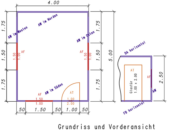 Im Süden geht es weiter: In dieser Außenwand mit brutto (also ohne Abzüge) 10 m² stecken Außentür (AT) und AF. Netto, also abzüglich dieser beiden Unterbrechungen bleiben 6,5 m². Ich folgere mit enormer Spitzfindigkeit:
