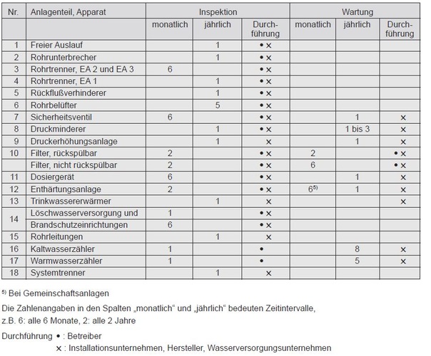 Auch eine Trinkwasser-Installation benötigt nach einem festen Zeitplan einige Wartungsarbeiten. Einige dieser Arbeiten kann der Betreiber selbst ausführen, andere sollte er dann doch lieber in Fachmann-Hände geben. Welche das sind, kann man schnell un übersichtlich folgender Tabelle entnehmen.