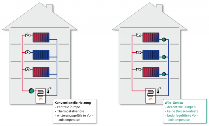 soll in der Praxis eine Heizenergieeinsparungen von 20 Prozent und eine Stromeinsparung von 50 Prozent durch das dezentrale Pumpensystem erreicht werden können.