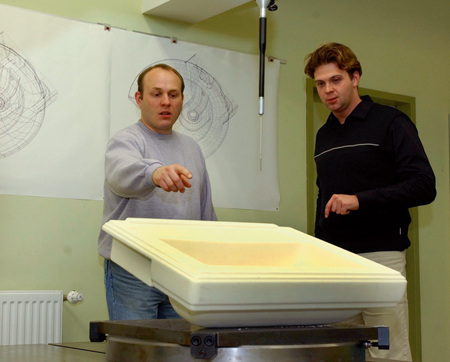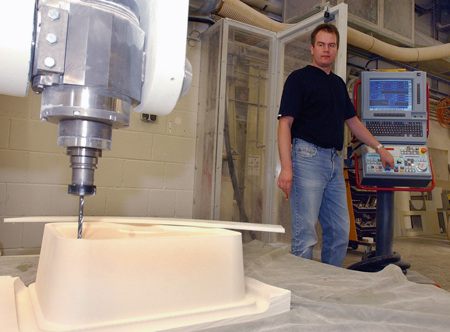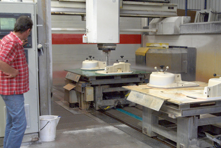 Im ersten Schritt auf dem Weg zu einem neuen Sanitärobjekt erstellen Designer Entwürfe im Maßstab 1:1. Ausgangspunkt sind dabei Vorgaben, wie zum Beispiel Marktrecherche. Zusätzlich spielt die Funktionalität eine Rolle bei der Gestaltung. Ist das Design O.K., kommen die Techniker zu Wort. Sie prüfen zunächst mal, ob sich die Idee des Formgestalters überhaupt technisch umsetzen lässt. Ferner muss gecheckt werden, ob das Modell die Produktnorm erfüllt, also ob z. B. die Anschlussmaße stimmen (Bild 2). Bei WCs ist darüber hinaus sicherzustellen, dass eine ausreichende Spülwirkung erzeugt wird. Erfüllt der Entwurf alle Erwartungen, wird ein Arbeitsmodell hergestellt. Bei den meisten Entwicklungen kommt hier Kollege Computer zum Zuge. Mit Hilfe eines CAD-Programms schneiden NC-gesteuerte Fräsen das Modell aus einem Gipsblock heraus (Bild 3). Schon hier muss eine Hürde für die spätere Produktion genommen werden. Denn wird der echte Objektkörper geformt, enthält er einen Wasseranteil, der sich während der weiteren Fertigungsschritte und beim Brennen verflüchtigt. Das führt dazu, dass das Objekt schrumpft. Der Fachmann spricht von einer Schwindung. Sie beträgt etwa 10 bis 13 %. Deshalb muss das Gipsmodell (Bild 4) um diesen Anteil größer sein. Schließlich dient es der Konstruktion der Mutterform.