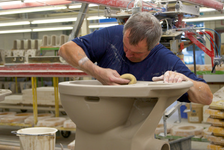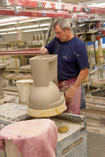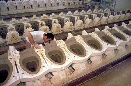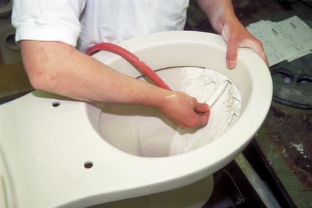 Um die Mutterform herzustellen, wird vom Gipsmodell ein Gipsabguss gemacht. Mit diesem als Form werden die ersten, echten Sanitärobjekte hergestellt. Die sind aber noch lange nicht für den Verkauf bestimmt. Man bezeichnet sie als Null-Serie. Das heißt, was hier herauskommt, wird erst mal ausgiebig getestet. Ferner versucht man herauszufinden, wie die spätere Fertigung noch verbessert werden kann. Von der Mutterform wird ein Kunststoffabguss gemacht. Diesen Abguss nennt der Porzellanprofi die „Einrichtung“. Sie dient dazu, bei der laufenden Produktion beliebig viele Gipsarbeitsformen anzufertigen. Für die Herstellung von Objekten aus Sanitärporzellan werden die Rohstoffe Ton, Kaolin, Feldspat und Quarz zu gleichen Teilen eingesetzt. Ton und Kaolin machen dabei die bildsamen Bestandteile der Masse aus, aus der das Objekt geformt wird. Feldspat, Quarz und Pegmatit sollen als unplastische Rohstoffe unter anderem dafür sorgen, dass die Bestandteile beim Brennen besser zusammenbacken und verdichten.