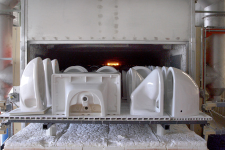Das Brennen ist der entscheidendste Produktionsabschnitt bei der Fertigung sanitärkeramischer Erzeugnisse. Denn nur durch den Brennvorgang und den dabei ablaufenden chemischen und physikalischen Vorgängen erhält das Produkt seine Gebrauchseigenschaften. Gebrannt wird in einem gasbefeuerten Tunnelofen. Der ist etwa 120 m lang und rund um die Uhr in Betrieb. Die Rohlinge werden dabei auf Brennwagen aufgesetzt und mit genau festgesetzter Geschwindigkeit als langer Wagenzug auf Gleisen durch den Ofen geschoben (Bild 11). In der Vorwärmzone (bis ca. 600 °C) werden die Scherben langsam aufgeheizt und dabei das mechanisch und chemisch gebundene Wasser ausgetrieben. Dann geht es in die Brennzone bis ca. 1200 °C. Die Hitze bewirkt, dass die Flussmittel (Feldspat / Flußspat) erweichen und zwischen den Ton- und Schamottenteilchen glasige Verbindungen entstehen lassen. Jetzt schmilzt auch die Glasur vollständig auf den Scherben auf. Und noch etwas passiert: Das Objekt schrumpft abermals um fünf bis sechs Prozent (Brennschwindung). In der Kühlzone wir dem Sanitärobjekt dann durch eine Luftströmung so viel Wärme entzogen, das seine Temperatur bei Verlassen des Ofens unter 100 °C liegt. Nach dem Brand werden alle Sanitärteile optisch auf Fehler untersucht. Fehlerhafte Produkte werden - wenn möglich - nachbearbeitet oder als Bruch eingestuft, zermalen und dem Gießschlicker wieder zugeführt. Einige Artikelgruppen gehen noch zu den Schleifstationen. Wichtig ist dies z. B. bei Einbauwaschtischen, bei denen die Montageflächen der Objekte mit wassergekühlten Schleifscheiben nachbearbeitet werden, damit sie perfekt in Bademöbel eingepasst werden können (Bild 12).