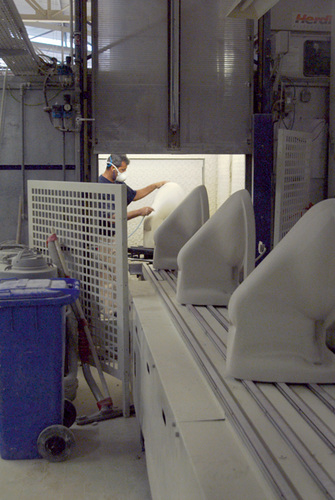 Nun folgt ein weiterer, wichtiger Schritt: das Aufbringen der Glasur. Die Glasur ist ein dünner, eingefärbter, glasartiger Überzug, der auf den getrockneten Scherben aufgetragen wird und Glanz und Farbe auf die Keramik bringt. Er besteht im Wesentlichen aus Feldspat, Quarz, Kreide, Kaolin und farbgebenden Zusätzen. Obwohl der Versatz genau eingewogen wird, muss jede Glasurcharge vor der Freigabe auf den Sollfarbton angepasst werden. Erst wenn der Farbton richtig und die ersten gespritzten Probestücke die Qualitätsprüfungen bestanden haben, wird die Glasur für den Betrieb freigegeben. Nur so kann sichergestellt werden, dass es zwischen den verschiedenen Produkten eines Herstellers keine Farbnuancen gibt. Das Auftragen der Glasur erfolgt durch eine, mit Druckluft betriebene Spritzpistole von Hand (Bild 8), aber auch durch automatische Spritzanlagen (Bild 9). Flächen, die mit der Pistole nicht erreichbar sind (z. B. die Spülränder eines Klosetts), werden mit Glasur ausgegossen (Bild 10). Aus der Glasurschicht zieht der Scherben Wasser heraus. So kommt es, dass sich eine 0,7 bis 1,0 mm dicke Glasurpulverschicht auf der Oberfläche des Rohlings ausbildet.