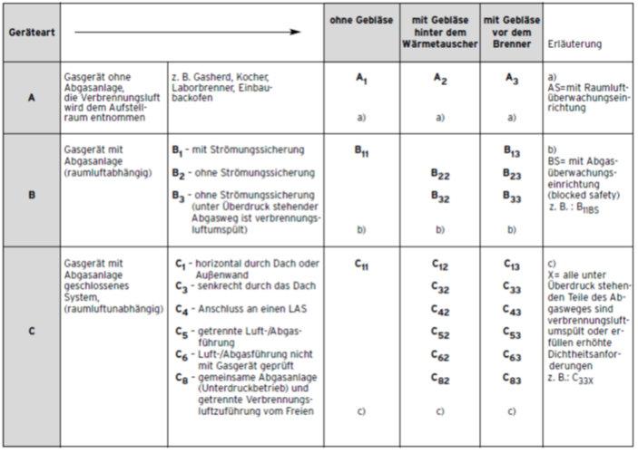 Für die hier erklärten Gasgerätearten gibt es gemäß TRGI bestimmte Regelungen für die Aufstellung und Abgasführung der Gasgeräte. Gasgeräte werden nach der Abgasabführung und der Verbrennungsluftversorgung wie folgt unterschieden: