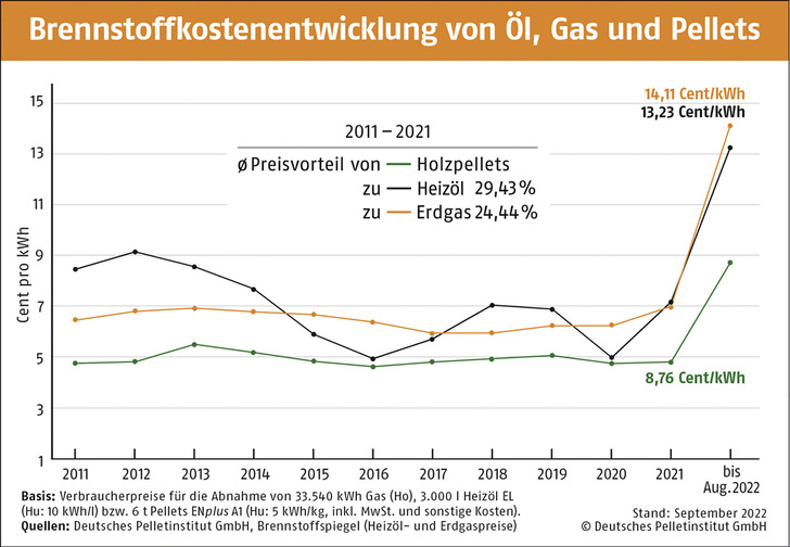 Der Pelletpreis war im letzten Jahrzehnt von einer geringen Dynamik geprägt. Die durchschnittliche jährliche Preissteigerung von 2012 bis 2021 lag bei nur 0,24 Prozent; inflationsbereinigt war sogar ein Preisrückgang von 1,44 Prozent zu verzeichnen. Während dieser Zeit gab es einige deutliche Preissprünge, vor allem beim Öl, ohne dass der Pelletpreis hierauf reagiert hätte. Das zeigt: Einen direkten Zusammenhang zwischen der Preisentwicklung von Pellets und fossilen Brennstoffen gibt es nicht. Es ist im Sommer 2022 außergewöhnlich, dass der Pelletpreis weiter steigt, da er um diese Jahreszeit normalerweise rückläufig ist. Die Gründe dafür liegen in den kriegsbedingten globalen Verwerfungen der Energiemärkte, deren Auswirkungen auch den Pelletmarkt treffen. Angesichts einer weiterhin zufriedenstellenden Rohstofflage in Deutschland ist die aktuelle Preissteigerung im Wesentlichen auf eine sprunghaft angestiegene Nachfrage sowie erhöhte Kosten bei Produktion und Transport der Holzpresslinge zurückzuführen – Ursachen, die allgemein für die bei vielen Produkten in Deutschland festzustellende Verteuerung gelten.