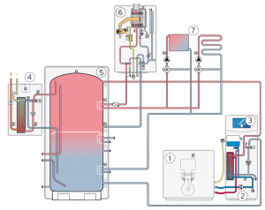 Die im KWK-Modul produzierte Wärme wird im Pufferspeicher eingelagert. Der Pufferspeicher ist ein Zwischenspeicher für Heizwasser. Das Heizungssystem und die Warmwasserversorgung nutzen die Wärme, Die Wärmeerzeuger, KWK-Modul oder Spitzenlastgerät, liefern die Wärme bedarfsgerecht. Dadurch wird sichergestellt, dass der Pufferspeicher immer die richtige Temperatur für die Wärmeverbraucher bereithält. Die Wärmeverbraucher (Trinkwasserstation,