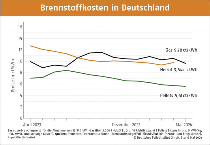 Holzpellets, -briketts und -hackschnitzel sind derzeit günstig zu haben. Eine Tonne Pellets kostet im Mai im Durchschnitt 280,69 Euro. Gegenüber dem Vormonat April ist der Preis um 2,8 Prozent gesunken. Die Preisersparnis gegenüber Heizöl liegt bei rund 42 Prozent und gegenüber Erdgas bei rund 43 Prozent.