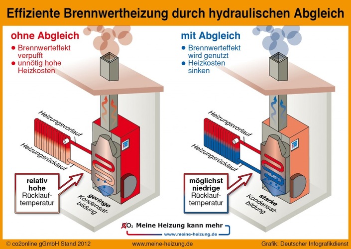 Ein Brennwertkessel kann mit Gas, Öl und inzwischen auch mit Pellets beheizt werden. Er kostet inklusive Einbau zwischen 5.000 und 10.000 Euro. Im Vergleich zu einem 20 Jahre alten Standardkessel spart er jährlich zwischen 10 und 20 Prozent der zugeführten Energie. In einem durchschnittlichen Einfamilienhaus (Verbrauch 2000 m³ Erdgas) sind das jährlich etwa 300 Euro. Der energiesparende Brennwerteffekt kommt allerdings nur vollständig zum Tragen, wenn das Heizwasser auf dem Weg vom Heizkörper zum Kessel unterhalb des Taupunktes des eingesetzen Brennstoffs abkühlen kann. Bei Erdgas sind das ca. 56°C, bei Heizöl 47°C. Fakt ist, je niedriger diese so genannte Rücklauftemperatur, desto besser für den Brennwerteffekt. Allerdings kann die Rücklauftemperatur nicht einfach an der Heizungsanlage eingestellt werden. Sie ergibt sich aus einer großen Spreizung zwischen Vorlauf und Rücklauftemperatur. Eine Heizungsoptimierung mit hydraulischem Abgleich nimmt direkten Einfluss auf die Spreizung. „Ein hydraulischer Abgleich ist eine wichtige Voraussetzung für effizientes Heizen. Hauseigentümer sollten ihn beim Einbau eines neuen Kessels gleich mit vornehmen lassen“, rät Tanja Loitz. Bei bereits installierten Brennwertkesseln kann der hydraulische Abgleich vom Fachhandwerker auch nachträglich vorgenommen werden.