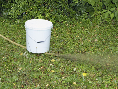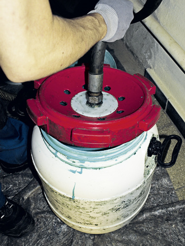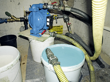 Sind die 30 Minuten vorüber, wird das Mittel abgelassen. Dabei ist die Leitung zu belüften; ansonsten fließt die Dispersion nicht in den Auffangbehälter. Wenn keine größeren Mengen Dichtmittel mehr „freiwillig“ austreten, wird die Leitung nochmals mit 3 bar Pressluft-Druck beaufschlagt. Durch schnelles Öffnen des Befüllhahnes reißt die Luft restliches Mittel aus der Leitung. Um ein Herausspritzen des Dichtmittels aus dem Auffangbehälter zu vermeiden, sollte man ihn mit einem Tuch abdecken. Diesen Vorgang wiederholt man solange, bis damit keine Abdichtungsflüssigkeit mehr aus der Leitung zu Tage gefördert werden kann.