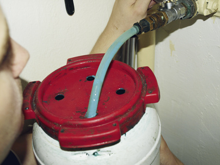 Ist die Gasleitung sauber, kann sie mit Dispersion gefüllt werden. Dabei muss sichergestellt sein, dass das verwendete Mittel das Verfallsdatum nicht überschritten hat. Die Befüllung geschieht mit einer Membranpumpe, die mit Stickstoff, aber auch mit Druckluft betrieben werden kann. Die Pumpe saugt die Abdichtungsflüssigkeit über ein Tauchrohr, das in den Dispersionseimer gehängt wird, an. Dabei ist es wichtig, dass das Mittel an der höchsten Stelle der Leitung noch mit einem Überdruck von 3 bar ansteht. Da die Pumpe bis zu 7 bar Druck erzeugen kann, ist die Sanierung von Leitungen mit bis zu 40 m Höhe möglich. Der Druck von mindestens 3 bar ist erforderlich, um das Mittel - wie schon beschrieben - in die undichten Gewindeverbindungen zu pressen.