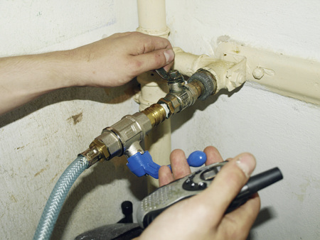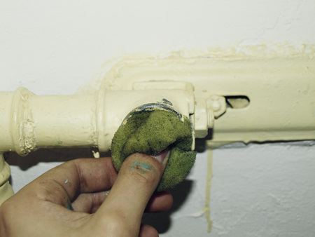 Bevor die Gasleitung mit der Abdichtungsdispersion gefüllt wird, muss sie von innen gereinigt werden. Schließlich kann man den größten Teil des Mittels später wieder aus der Leitung ablassen und weiter verwenden. Das geht aber nur, wenn das Mittel nicht allzu verunreinigt ist. Zur Reinigung wird die Leitung mit inerten Gas oder mit Druckluft unter etwa 3 bar Druck gesetzt. Am weitesten Rohrquerschnitt wird ein Schlauch angeschlossen und bis ins Freie geführt. Dann wird der Kugelhahn am Schlauchanfang schlagartig geöffnet. Der Druckabfall reißt Dreck, Rost und Staub aus dem Rohr. Diesen Vorgang wiederholt man solange, bis dabei keine Verunreinigungen mehr austreten. Hat man dafür keine freie Fläche (wie z. B. ein Rasen-Stück) zur Verfügung, sollte man bei den ersten Ausblasvorgängen einen nassen Sack über das Schlauchende stülpen, um den Staub ein wenig auszufiltern. Schließlich trägt Roststaub, der in direkter Nähe von Fenstern in die Luft gepustet wird, nicht zur Kundenzufriedenheit bei.