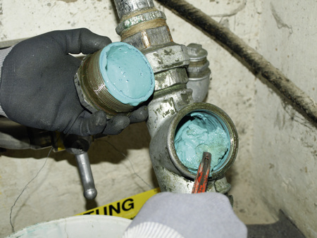 In den Bauten der 50iger Jahre liegen die Rohre häufig dicht beieinander. Um hier Gewindeverbindungen zu erneuern, muss man tief in die Trickkiste greifen. Oft bleibt einem sogar nichts anderes übrig, als unbeanstandete Leitungen zu demontieren, um an das Sorgenkind heranzukommen. Wenn man dann zu den undichten Gewinden vorgedrungen ist, können die Erschütterungen und Bewegungen, die bei ihrer Reparatur unvermeidbar entstehen, bis dato dichte Gewinde undicht ruckeln. Willkommen zur „Leck-Jagd“ entlang der Leitung und Waidmannsheil. Kann eine Leitung nicht einfach komplett erneuert werden, stellt die Anwendung des Innenabdichtungsverfahrens nach DVGW-Arbeitsblatt G 624 [1] eine gute Alternative zur herkömmlichen Reparatur dar. Allerdings können mit dieser Technik nur undichte Gewindeverbindungen saniert werden. Es handelt sich also nicht um ein Heilmittel für Korrosionsschäden. Und es ist auch keine „Innenbeschichtung“, kein „Ausschäumen“ und auch kein „Ausschleudern“, auch wenn man diese Begriffe in der Praxis oft zu hören bekommt. Vereinfacht beschrieben, wird ein flüssiges Abdichtungsmittel (auch Dispersion genannt) in die Leitung eingefüllt und unter Druck gesetzt. In die Kapillaren der undichten Gewinde dringt das Mittel ein. Wird die Füllung anschließend wieder abgelassen, verbleibt das in die Gewinde eingepresste Mittel dort und dichtet diese ab. Das klappt aber nur, wenn das Leck nicht zu groß ist. In einer Verbindungsstelle, die 5 l/h oder gar noch mehr Gasverlust hat, kann sich das Mittel nicht festsetzen. Hier würde die Dispersion direkt wieder ausfließen. Man erreicht nichts, von der verursachten Sauerei mal abgesehen.