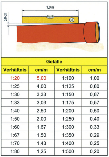 Damit so etwas bei richtig ausgewählten Nennweiten nicht passiert, dürfen ein Mindestgefälle nicht unterschritten bzw. ein Maximalgefälle nicht überschritten werden. Für unbelüftete Einzel- und Sammelanschlussleitungen ist mindestens 1 cm/m Neigung erforderlich. Sind die Leitungen belüftet, kann auf 0,5 cm/m reduziert werden. Ein Maximalgefälle ist für diese Leitungen nicht festgelegt. Für Feststoffe führende Leitungen ergibt es sich durch die Höhe des WC-Anschluss-Stutzens quasi ganz natürlich; über die anderen Sanitärobjekte werden keine Feststoffe entwässert, wodurch sich eine Schwimmtiefe erübrigt. Sammelleitungen sind durch die Tatsache, dass über diese Fallleitungen entwässern, belüftet. Sie müssen folglich - wie die belüfteten Anschlussleitungen - mindestens 0,5 cm/m Gefälle haben. Dies gilt auch für Grundleitungen, die unterhalb des Gebäudes verlegt werden. Liegen Grundleitungen außerhalb des Gebäudes, hängt das Mindestgefälle von ihrer Nennweite ab. Hierfür gilt das Verhältnis 1:DN. Wird also eine Grundleitung in DN 100 außerhalb eines Gebäudes verlegt, muss sie ein Mindestgefälle von 1:100 aufweisen, d. h. 1 cm/m. Sammel- und Grundleitungen dürfen maximal mit einem Gefälle von 5 cm/m geführt werden, was einem Verhältnis von 1:20 entspricht.